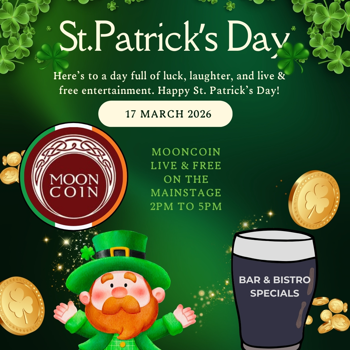 17 MARCH 2026 Here’s to a day full of luck, laughter, and live & free entertainment. Happy St. Patrick’s Day! MOONCOIN LIVE & FREE ON THE MAINSTAGE 2PM TO 5PM […]
